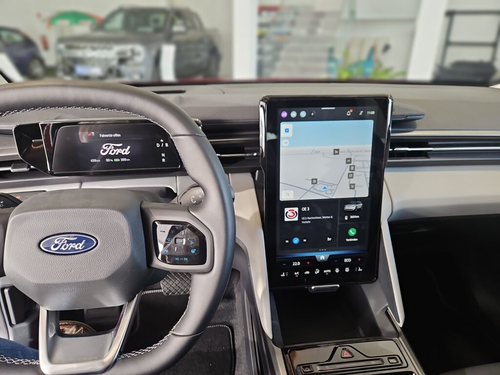 Ausweichassistent (ESA - Evasive Steer Assistance), Akustisches Fahrzeugwarnsystem (AVAS), Reifen 235/55 R19 vorne, 255/50 R19 hinten, Außenspiegel elektrisch anklapp- und einstellbar, beheizbar, mit integrierten Blinkleuchten, Kabellose Smartphone-Integration via Apple CarPlay und Android Auto, Ford Key Free-System (schlüsselfreies Ent-/Verriegeln und Starten), Haltegriffe, Verkehrsschild-Erkennungssystem, Laderaumbeleuchtung, 12-Volt-Anschluss im Gepäckraum, Teppichfußmatten vorn, Velours, Verzurrösen im Gepäckraum, Intelligenter Geschwindigkeitsbegrenzer (Intelligent Speed Assist), Leselampen, vorne und hinten, Mode 3, Typ 2 Ladekabel, Spracherkennung, Zweiter Schlüssel, Audiosystem mit 7 Lautsprechen inkl. Soundbar, Make-up-Spiegel, beleuchtet, Türgriffe außen, beleuchtet, Zweiter Ladeboden, Müdigkeitswarner, Zugang zum BlueOval Charge Network (Ladekosten exklusive), Cross Traffic Alert inkl. Notbrems-Funktion beim Rückwärts-Ausparken, integrierte Glasgrafik an C-Säule, Garantie 2 Jahre, MegaConsole mit Staufach und 2 Getränkehaltern, Schaltgetriebe : 1-Gang-Automatikgetriebe, Fahrersitz, beheizbar, Beifahrersitz, 6-fach manuell einstellbar, Post-Collision-Assist, Beifahrersitz, beheizbar, Heckklappe manuell, Pre-Collision-Assist inkl. Auffahrwarnsystem und Notbremsfunktion, 360 Grad Kamera, Sicherheitsgurtstraffer vorn und an den äußeren Sitzplätzen der 2. Sitzreihe, Heckklappe elektrisch, sensorgesteuert (Öffnen und Schließen per Fußbewegung), Fahrmodus-Schalter, Gepäckraumabdeckung, herausnehmbar, Fahrzeug-Vorkonditionierung (Batterie und Innenraum), Aktiver Park-Assistent, Heckspoiler, integriert, Garantie 5 Jahre, Rücksitzbank, 60:40 geteilt umklappbar, Zierelemente "Liquid Cosmos", Ford SYNC Move, Falschfahrer-Warnfunktion, Warnsystem für nicht angelegten Sicherheitsgurt in der 1. und 2. Sitzreihe, Ereignisdatenrekorder (gesetzlich vorgeschrieben), Park-Pilot-System hinten, Integriertes Modem, Seitenscheiben ab 2. Sitzreihe und Heckscheibe, dunkel getönt, LED-Scheinwerfer mit Fernlicht-Assistent, Lenkrad : Soft-Touch Lenkrad, Sensico, Fahrersitz, 12-fach elektrisch verstellbar mit Memory-Funktion, inkl. Lendenwirbelunterstützung, Außenspiegel in Schwarz, Kopfstützen hinten, einstellbar, Fahrerassistenz-Paket, Wärmepumpe, ABS, Alarmanlage, Alufelgen, Beifahrerairbags, Bluetooth, Elektr. Fensterheber, ESP, Fahrerairbag, Head-Up-Display, ISOFIX, Klimaanlage, LED-Scheinwerfer, Lederausstattung, Lenkradheizung, Mittelarmlehne, Navigationssystem, Notrufsystem, Panoramadach, Radio, Reifendruckkontrolle, Rückfahrkamera, Servolenkung, Sportsitze, Spurhalteassistent, Tempomat, Touchscreen, Traktionskontrolle, Wegfahrsperre, Fernlichtassistent, Induktionsladen