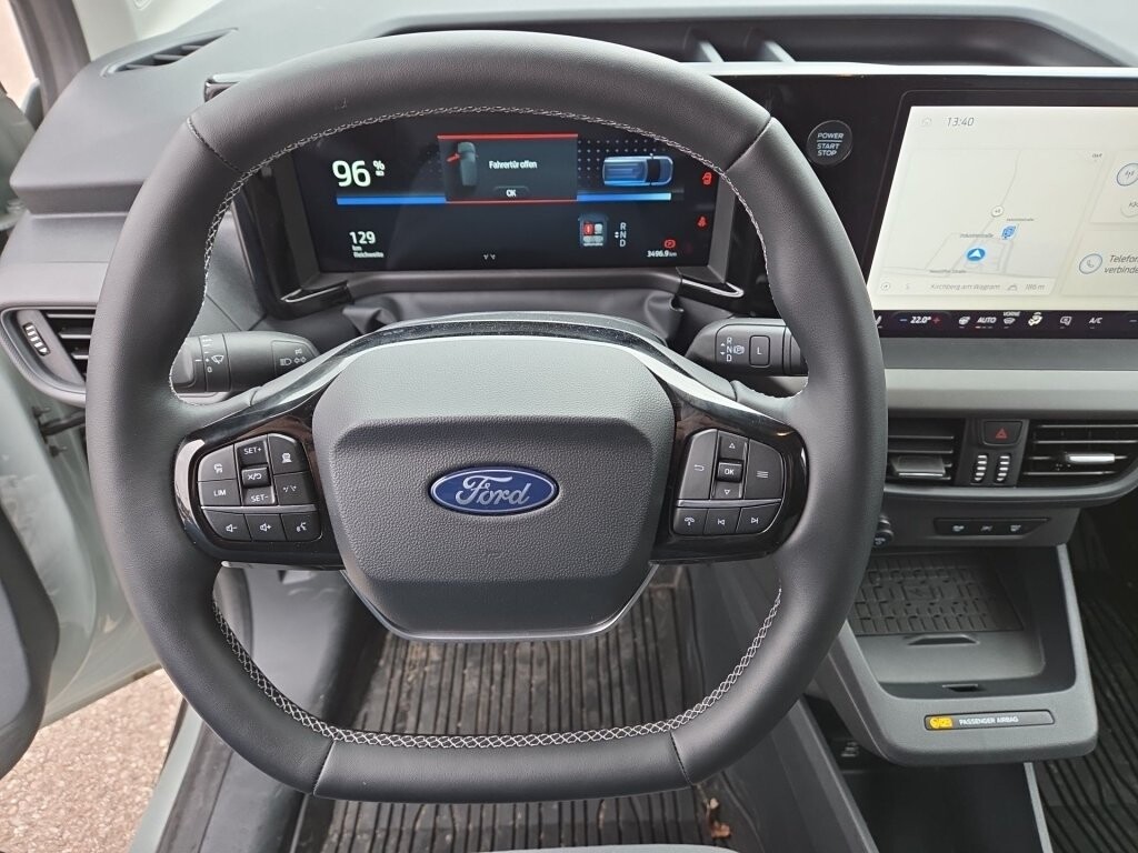 Ford Power-Startfunktion (schlüsselfreies Starten), Abdeckleiste der Schiebetürführung, Verkehrsschild-Erkennungssystem, Laderaumbeleuchtung, Zusatzheizer im Motorraum (PTC-heater), Außenspiegel zusätzlich elektrisch einstellbar, anklappbar und mit Umfeldbeleuchtung, Audio-Paket 2, Fußmatte, vorn, gummiert, Fahrerassistenz-Paket 2, Lenkrad mit Sensico-Kunstleder, Lackierung Cactus Grey, Toter Winkel Assistent mit Cross Traffic Alert, Intelligenter Geschwindigkeitsbegrenzer mit Tempolimit-Anzeige, Ohne Heckfenster, Fahrspur-Assistent zusätzlich mit Fahrspurhalte-Assistent und Spurwechsel-Assistent, Sonnenblenden, Beifahrerseite mit Spiegel, Müdigkeitswarner, Notbremslicht (Warnblinkaktivierung bei starkem Bremsen), Lenkrad: Lenkrad, beheizbar, Audio-Paket 3, Sonnenblende für Fahrer mit Tickethalter und Kosmetikspiegel, 2 Fahrzeugschlüssel mit Fernbedienung, FordPass Connect Modem, Mittelkonsole, groß, Fensterheber elektrische, vorne mit 1-Touch-Down für Fahrer und Beifahrer, Garantie 2 Jahre, Polster : Limited, Handschuhfach mit Deckel, Ladekabel für öffentliche Ladestation (Typ 2) (8 m), Lackierung : Frozen White, Sicherheitsgurtstraffer Fahrer und Beifahrer, Pre-Collision-Assist, kamera-basiert, Türgriffe in Wagenfarbe, 12-Volt-Anschluss in Laderaum, Park-Pilot System, hinten, Ladestation, induktiv, für mobile Endgeräte, Feststellbremse, elektrisch, 12-Volt Anschluss, im Fahrgastraum, Warnsystem für nicht angelegten Fahrer-/Beifahrer-Sicherheitsgurt, Ford Easy Fuel mit Fehlbetankungsschutz, Aussenspiegel, elektrisch einstellbar und beheizbar, schwarz lackiert, Türgriffe, innen Chrom, Falschfahrer-Warnfunktion, Überkopf-Ablagefach, Kühlergrill Chrom-Dekor, Doppelflügelhecktür, Innenbeleuchtung mit Verzögerungsschaltung und Leselampen vorn, Park-Pilot-System, vorn, Pre-Collision Assist, kamera- und radar-basiert, Schaltgetriebe : Direktantrieb 1-gang, Reifendruck Kontrollsystem (TPMS), Winter Paket 2, Fahrerassistenz-Paket 3, Laderaumbeleuchtung LED, Laderaumboden aus Hartholz, Schmutzfänger vorn und hinten, ABS, Alufelgen, Beifahrerairbags, Bluetooth, Bordcomputer, ESP, Fahrerairbag, Frontscheibenheizung, Innenspiegel autom. abblendend, Klimaanlage, LED-Scheinwerfer, Multifunktionslenkrad, Nebelscheinwerfer, Notrufsystem, Reifendruckkontrolle, Rückfahrkamera, Schiebetür, Servolenkung, Spurhalteassistent, Start/Stop-Automatik, Tagfahrlicht, Tempomat, Traktionskontrolle, Fernlichtassistent, Winterpaket